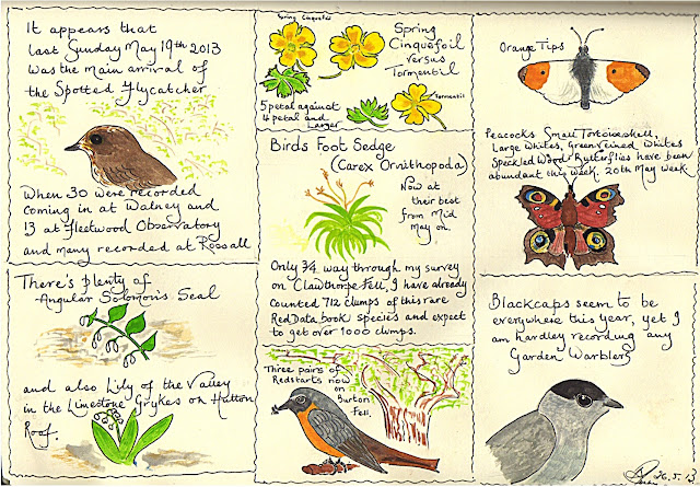 Today I went to Clawthorpe Fell with main emphasis on seeing if one of our Spotted Flycatchers had returned but check all his usual spots but nothing yet! A couple of Chiffchaff in song. The rare Birds Foot Sedge was spreading with many hundreds in flower and on show. Also overhead Ravens (from the Quarry), Several Early Purple Orchids, Birds Foot Trefoil, Wild Strawberry, Rue Leaved Saxifrage, Herb Robert, Spring Cinquefoil (not many perhaps 10 flowers at best!), Dog Violets, Maidenhair Spleenwort, Common Rue, Nice early specimens of the Rigid Buckler Fern, early Ragwort, early English Stonecrop, Wood Anemone in the grykes etc.